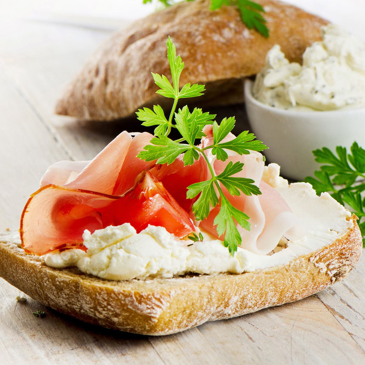 - Spread Cream Cheese on the rye bread slices, top one slice with the vegetables and ham and add the second slice on top