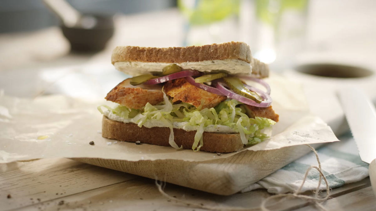- Add slices of paprika chicken, romaine lettuce and slices of red onion and cornichons