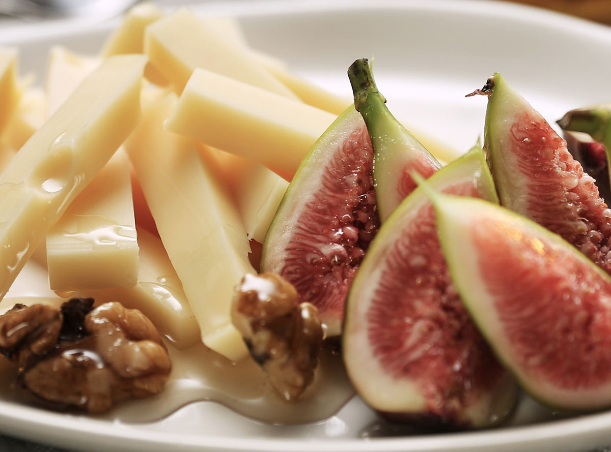Yummy! An easy and tasty afternoon snack of crunchy walnuts, sticky honey, sweet figs and creamy Arla Emmental.
