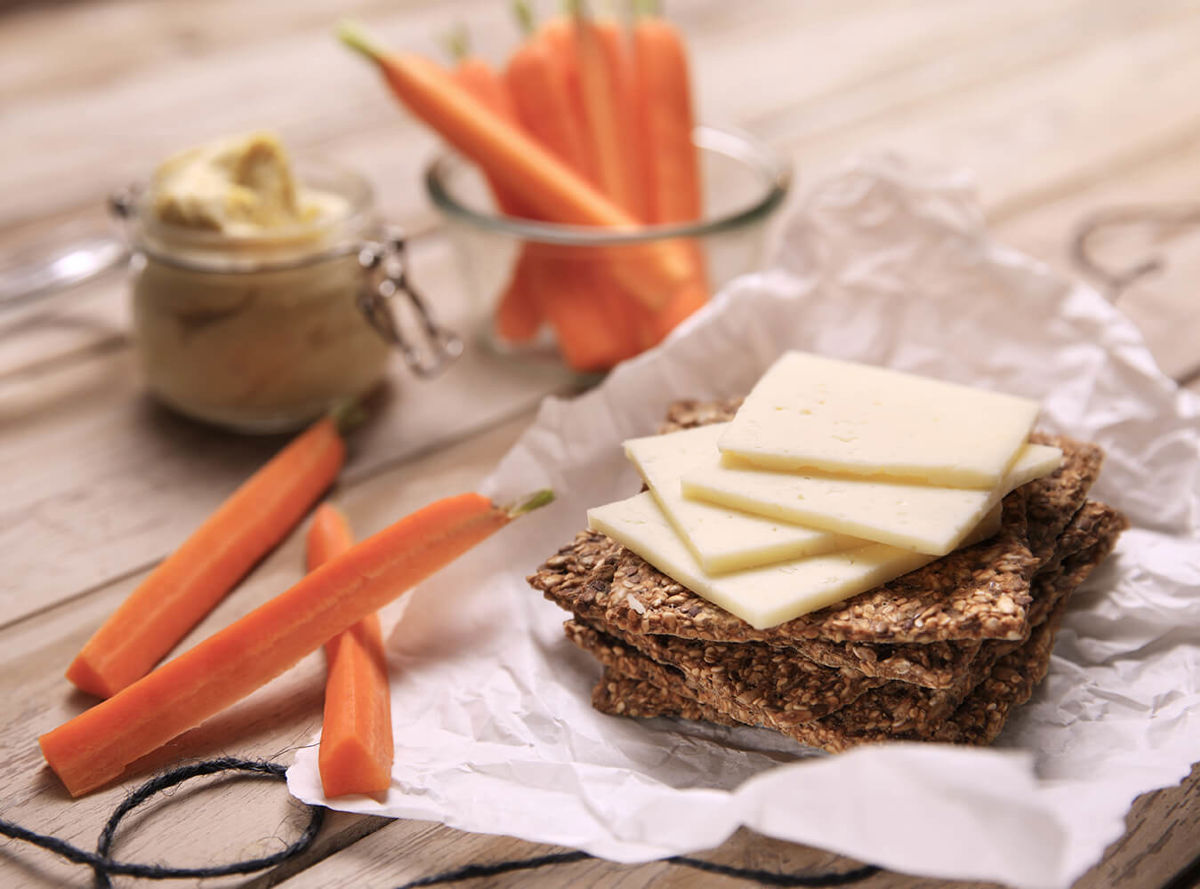 Naturally tasty Arla Havarti with wholegrain crackers, carrot sticks and hummus is the reliably wholesome bite that will satisfy hunger on the go!