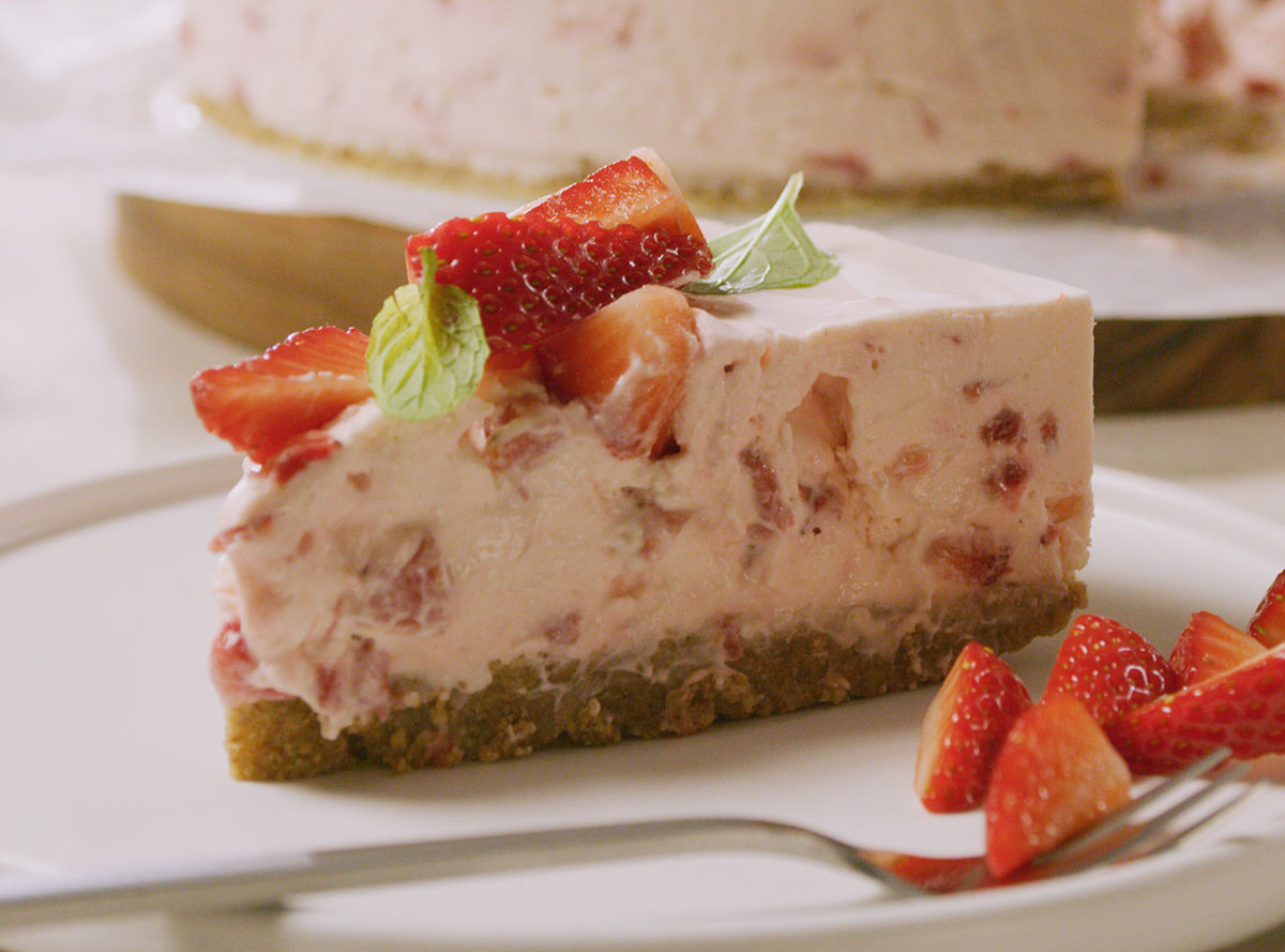 Enjoy a smooth strawberry filled cheesecake blending tart lemons and fresh strawberries with naturally tasty Arla Cream Cheese.